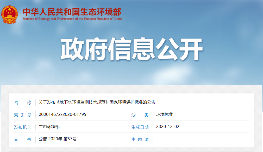 關(guān)于發(fā)布《地下水環(huán)境監(jiān)測(cè)技術(shù)規(guī)范》國(guó)家環(huán)境保護(hù)標(biāo)準(zhǔn)的公告