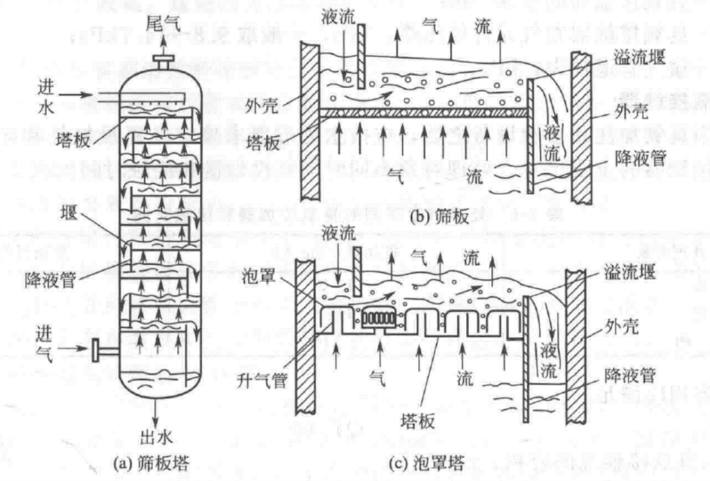 如上圖所示,塔內(nèi)每50-70mm設(shè)一層塔板,每層塔上設(shè)溢流堰和降液管,液體在塔板上翻過(guò)溢流堰,經(jīng)降液管流到下層塔板。